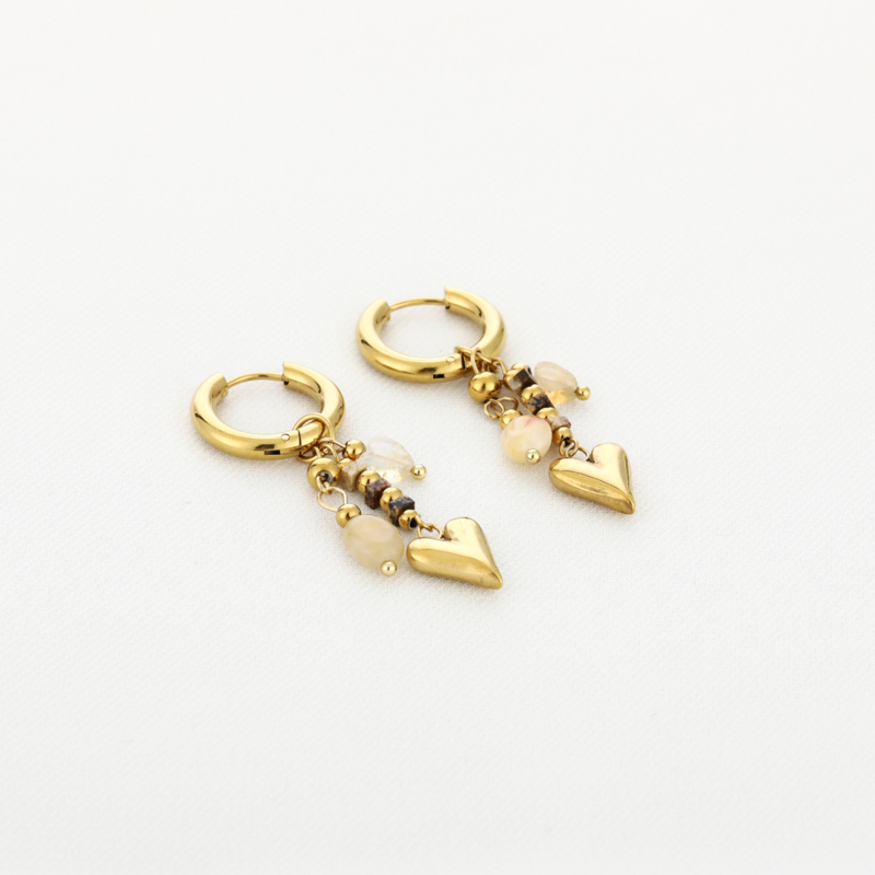 Stainless steel oorbellen goud met hart en beige kralen