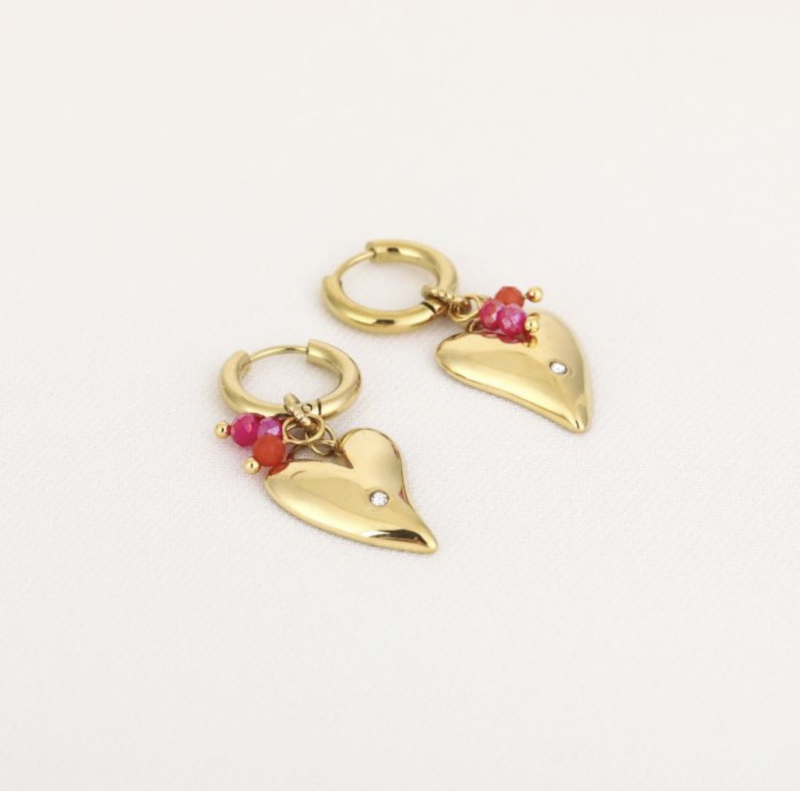Stainless steel oorbellen goud met kralen en hart roze en rood