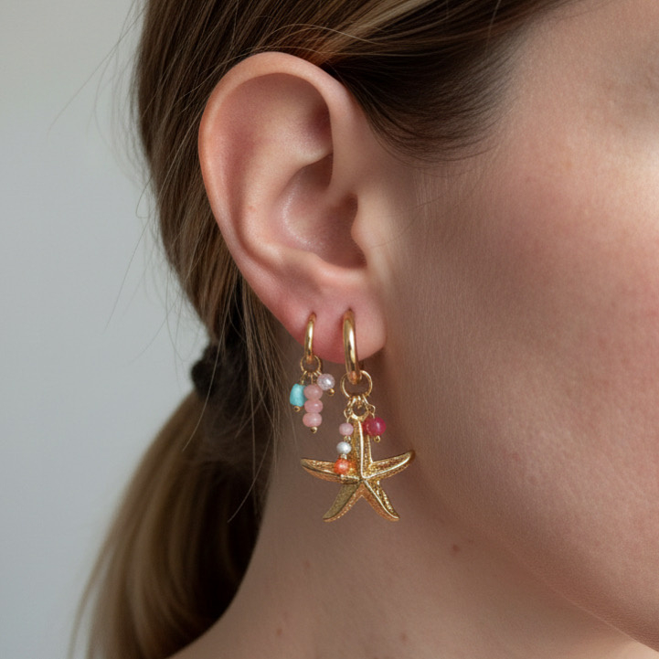 Oorbellen stainless steel goud met zeester en kralen