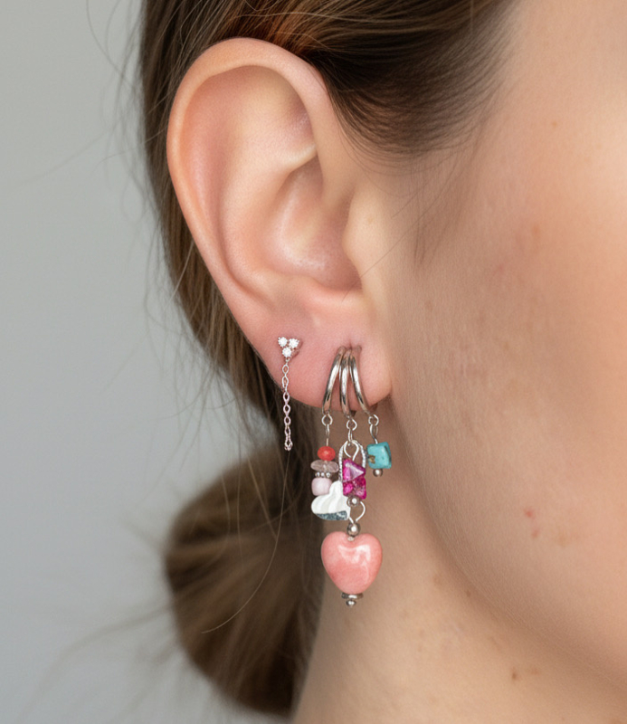 Wat deze oorbellen echt bijzonder maakt, is het unieke 3-in-1 effect. Het lijkt alsof je drie oorringetjes tegelijk draagt, terwijl je slechts één gaatje nodig hebt. Zo creëer je moeiteloos een stijlvolle, gelaagde ear look zonder extra piercings.